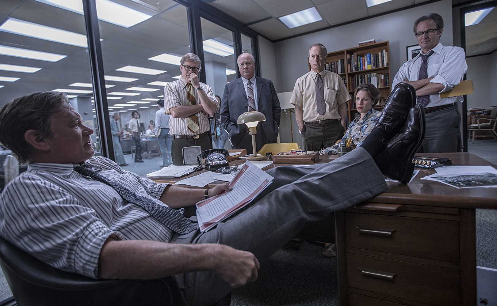 Close to the end of the film when we are about to find out the supreme court’s judgement the rising action is shown using two devices. Both the devices are placed in the tumultuous newsroom of the Washington Post. The first one, is a journalist in the midst of the newsroom who is seen nervously clutching the receiver of a phone as the judgement is rolled out. The second device, is a man in an office adjoining the newsroom who awaits the judgement by a fax machine. The journalist is a more dynamic figure and I was sitting in the cinema hall hoping that she beats the man to the judgement. Yet, just a couple of moments later the man comes out and broadcasts the news just in time to beat her to it. The newsroom goes into a state of pandemonium, and so do I, in the limited scope of my cushioned seat.