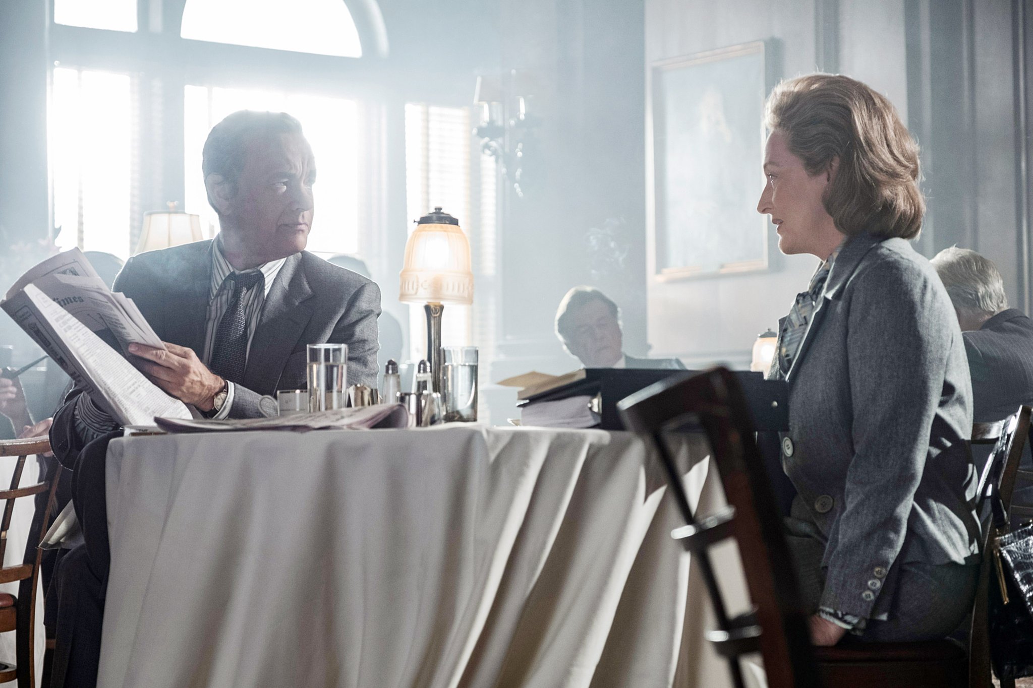 Meryl Streep is an absolute delight. She is a powerful figure in the male dominated bureaucracy of the era which is time and again elicited during the course of the film. She is measured as a boss and emotional as a mother and gives much more than what the text demands. Her relationship with her employee, Ben Bradlee, wonderfully portrayed by Tom Hanks, is a treat to watch. Spielberg lets the actors do the job and doesn’t mess with much movement. He keeps his frames still and gives them freedom. Michael Kahn, Spielberg’s editor, doesn’t get too experimental either. He lets it roll as long as it can.